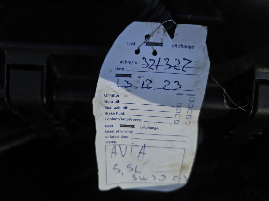 Visa informācija par pēdējo apkopi - eļļu, filtriem un zobsiksnu.